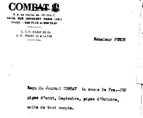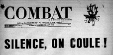 Combat, quotidien << De la Résistance à la Révolution >>, Organe du Mouvement de libération nationale d'Henri Frenay (1905-1988) devenu en 1941: "Combat ". << En juillet 1941, paraît le premier numéro du journal Libération. Suivi en décembre, par les journaux Combat et Franc-Tireur . Ces trois feuilles résultent des efforts de groupes constitués autour de fortes personnalités qui ont très tôt ressenti le besoin de «faire quelque chose»: Emmanuel d'Astier de La Vigerie pour Libération, Henri Frenay pour Combat, Jean-Pierre Lévy pour Franc-Tireur. >> in Libération. Albert Camus au coté de Pascal Pia fut l'éditorialiste du Combat de la Libération de Paris. Combat a cessé de paraître le 30 août 1974. |
